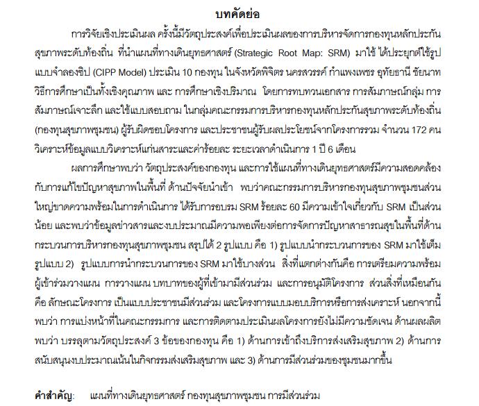 ประสิทธิผลของการบริหารจัดการกองทุนหลักประกันสุขภาพระดับท้องถิ่นที่ใช้แผนที่ทางเดินยุทธศาสตร์