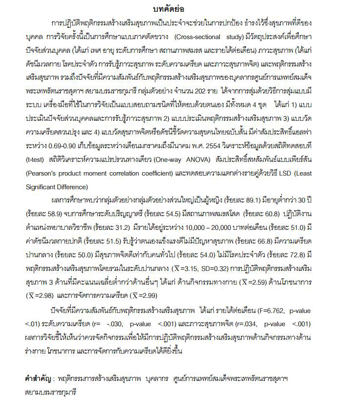 ปัจจัยส่วนบุคคล ภาวะสุขภาพ และพฤติกรรมสร้างเสริมสุขภาพของบุคลากร ศูนย์การแพทย์สมเด็จพระเทพรัตนราชสุดาฯ สยามบรมราชกุมารี