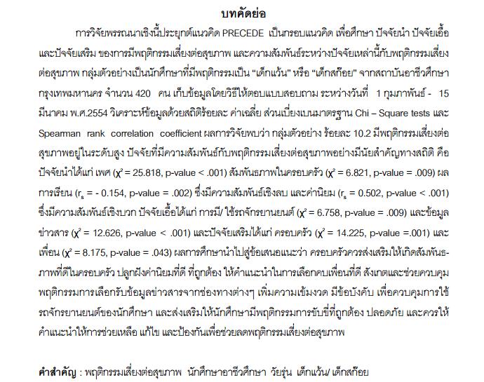 ปัจจัยที่มีความสัมพันธ์กับพฤติกรรมเสี่ยงต่อสุขภาพของการเป็น"เด็กแว้น" หรือ "เด็กสก๊อย" ในนักศึกษาระดับอาชีวศึกษา กรุงเทพมหานคร